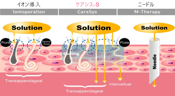 Caresis-S使用的電穿孔(電穿孔法)透過對皮膚角質層施加電刺激,形成細胞間隙,透過打開電子孔(電洞),使藥物滲透到真皮中層。其滲透效果可望達到離子電滲透療法的20倍。
